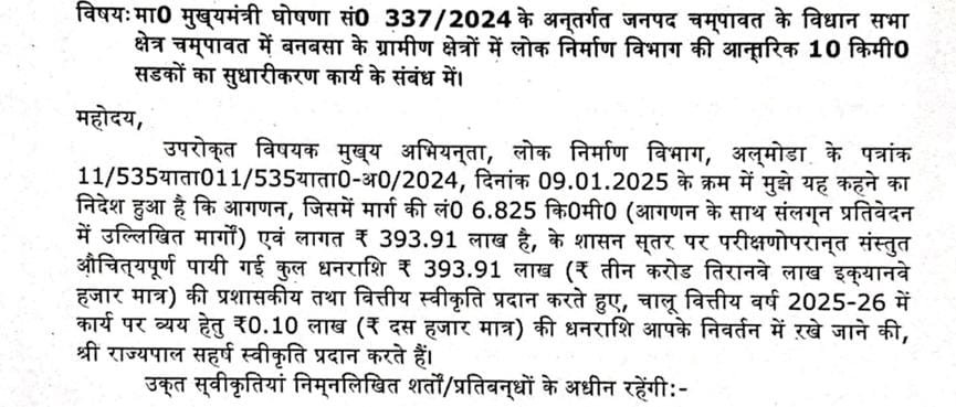 इसी प्रकार मा० मुख्यमंत्री घोषणा सं. 337/2024 के अंतर्गत बनबसा क्षेत्र के ग्रामीण इलाकों में लोक निर्माण विभाग की आंतरिक सड़कों के सुधारीकरण कार्य हेतु प्रस्तावित 6.825 किमी मार्ग के लिए ₹393.91 लाख (रुपये तीन करोड़ तिरानवे लाख इक्यानवे हजार मात्र) की प्रशासकीय एवं वित्तीय स्वीकृति जारी की गई है।