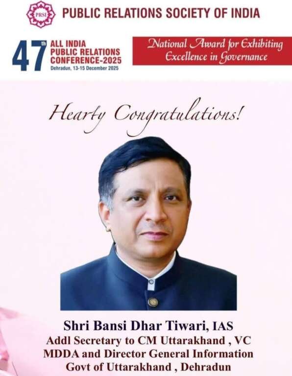 देहरादून। मुख्यमंत्री कार्यालय में अपर सचिव, महानिदेशक सूचना तथा एमडीडीए के उपाध्यक्ष के रूप में कार्यरत आईएएस बंशीधर तिवारी को “सुशासन उत्कृष्टता” के लिए राष्ट्रीय पुरस्कार से सम्मानित किया गया है। प्रशासनिक दक्षता, पारदर्शिता और सुशासन को मजबूत करने के उनके उत्कृष्ट कार्यों को देखते हुए यह प्रतिष्ठित सम्मान प्रदान किया गया।