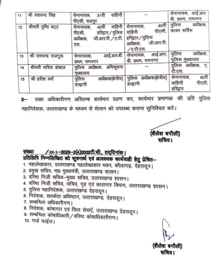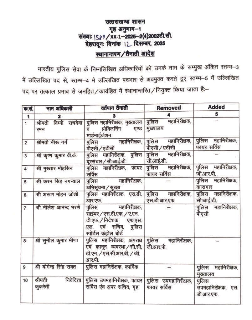 देहरादून। उत्तराखंड शासन के गृह अनुभाग-1 ने शुक्रवार 12 दिसंबर 2025 को भारतीय पुलिस सेवा (IPS) के कई वरिष्ठ अधिकारियों के व्यापक स्थानांतरण और तैनाती आदेश जारी किए। शासन ने इन्हें जनहित/कार्यहित में तत्काल प्रभाव से लागू करने का निर्देश दिया है। आदेश संख्या 1580/XX-1-2025-2(4)2002टी. सी. के अनुसार कुल 10 अधिकारियों के पदों में बदलाव किया गया है।