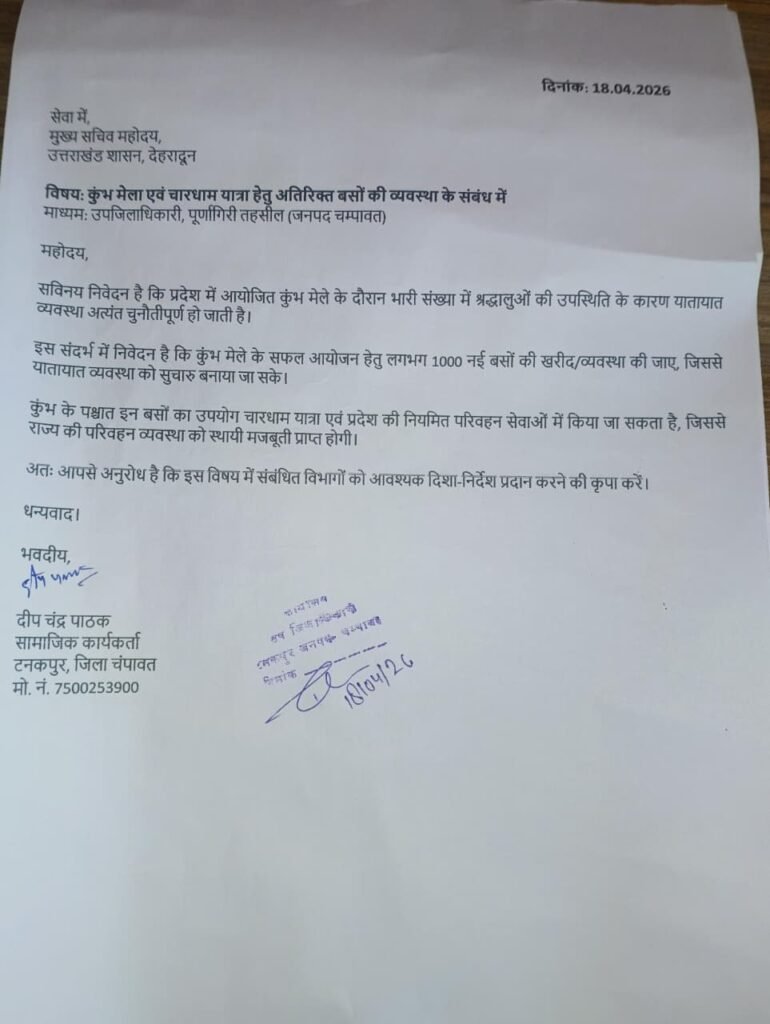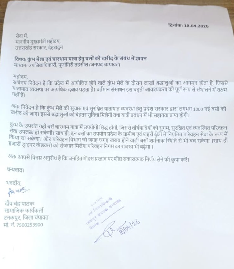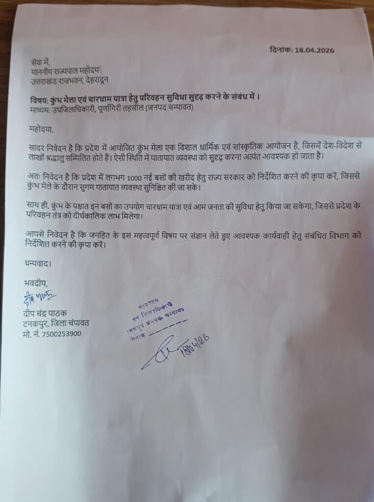 समाजसेवी दीप चंद्र पाठक द्वारा प्रदेश में आयोजित होने वाले कुंभ मेला एवं चारधाम यात्रा के दृष्टिगत परिवहन व्यवस्था को सुदृढ़ करने की मांग को लेकर ज्ञापन प्रेषित किया गया।