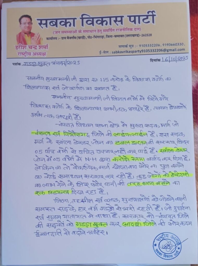 पिछले दो दिन पूर्व उत्तराखंड के मुख्यमंत्री पुष्कर सिंह धामी के दो दिवसीय आदर्श जनपद चंपावत के क्षेत्र भ्रमण में गंभीर सवाल खड़े किए हैं माननीय मुख्यमंत्री जी द्वारा 115 करोड़ के विकास कार्यों का शिलान्यास एवं लोकार्पण का स्वागत करते हुए कहा कि माननीय मुख्यमंत्री जी द्वारा विगत वर्षों में किए गए विकास कार्य के शिलान्यास अभी तक अधूरे हैं तमाम घोषणाएं अभी तक अधूरी है संभावित विधानसभा क्षेत्र में मुख्य सड़क मार्ग जो चंपावत एवं पिथौरागढ़ जिले की लाइफ लाइन है इस सड़क मार्ग के स्वांला डेंजर जोन का डबल इंजन की सरकार विगत 5 वर्षों से कोई उचित उपचार नहीं कर पाई स्वांला डेंजर जोन में 5 वर्षों में एन एच द्वारा करोड़ों रुपया बर्बाद कर दिया है लेकिन ना तो वैकल्पिक मार्ग खोजा गया और ना ही पुल बनाने की कोई सरकार समाधान कर रही है कुछ लोगों को ठेकेदारी का लाभ देने के लिए पानी की तरह पैसा बहाने का एक षड्यंत्र दिख रहा है जिला तहसील एवं ब्लॉक मुख्यालय को जोड़ने वाले समस्त मोटर मार्ग गढों से भरे हैं जो दुर्घटना एवं सुगम यातायात योग्य नहीं है सरकार को जनपद चंपावत की सड़कों को गड्ढा मुक्त कर आदर्श जिले की ओर ईमानदारी से काम करके आगे बढ़ाने की जरूरत है