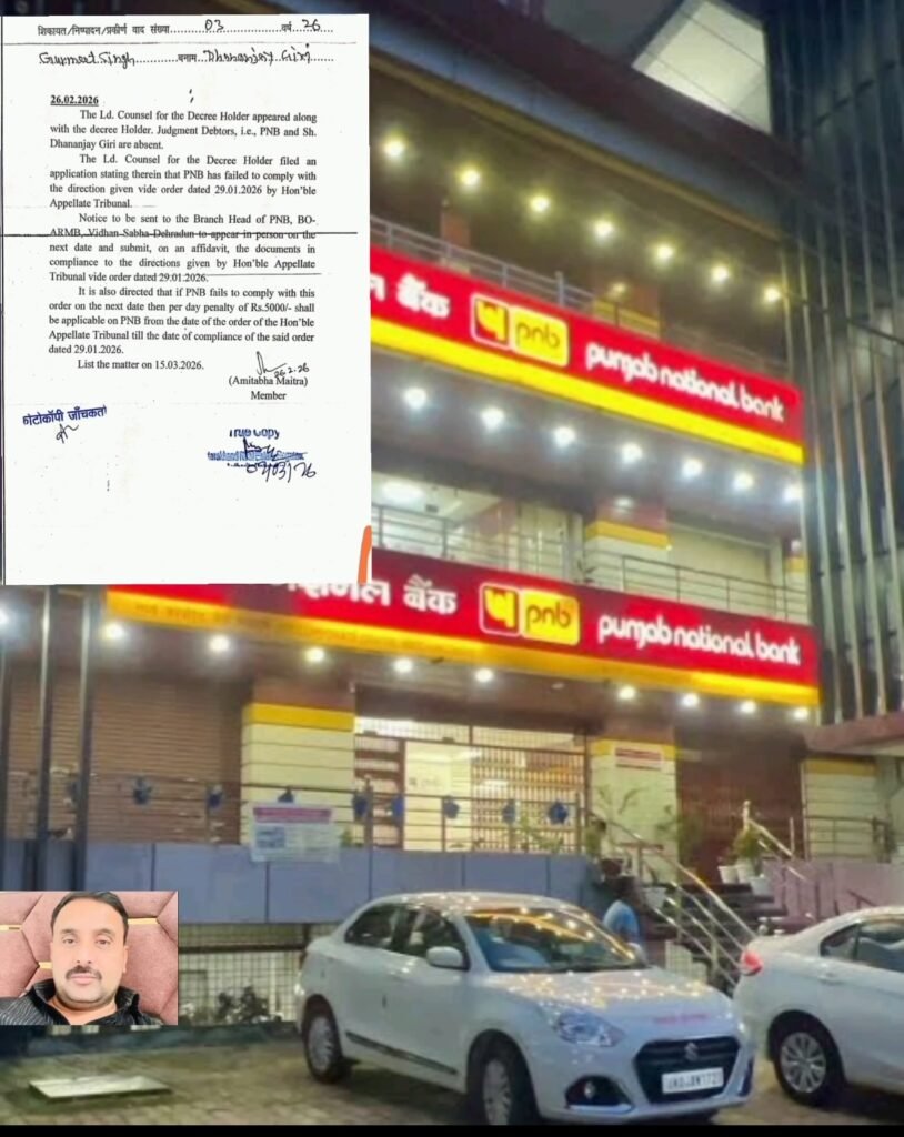 आदेश के अनुसार, डिक्री होल्डर की ओर से अधिवक्ता ने ट्रिब्यूनल को अवगत कराया कि 29.01.2026 के अपीलीय आदेश का पालन PNB द्वारा नहीं किया गया। सुनवाई के दौरान जजमेंट डेब्टर के रूप में PNB और धनंजय गिरी अनुपस्थित रहे, जिस पर ट्रिब्यूनल ने नाराजगी जाहिर की।