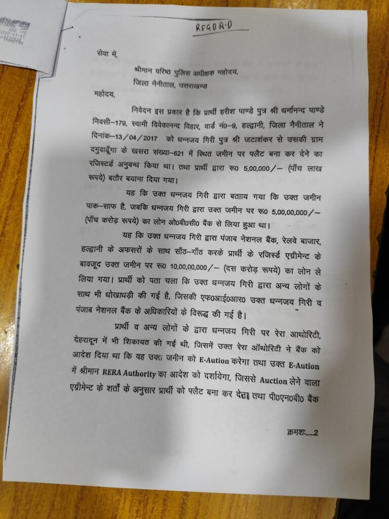 इसी बीच, हल्द्वानी में पंजाब नेशनल बैंक (PNB) की कार्यप्रणाली पर गंभीर सवाल उठे हैं। शहर के सम्मानित नागरिक और एलआईसी में 35 वर्षों से सेवा दे रहे हरीश पांडे ने बैंक के अधिकारियों पर भ्रष्टाचार और बिल्डर से मिलीभगत का गंभीर आरोप लगाया है।